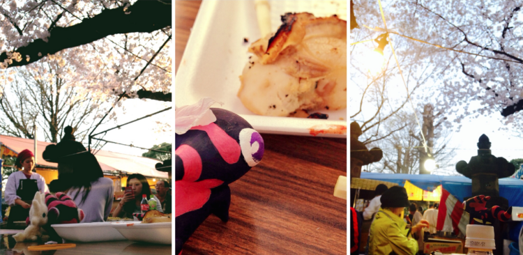 お昼ごはんも桜の下で! 神社の前に屋台がたくさん出ていたので、