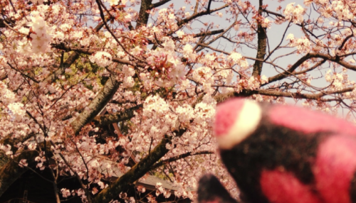 きれいな薄ピンク色の桜に鯉壱も興味を示している…