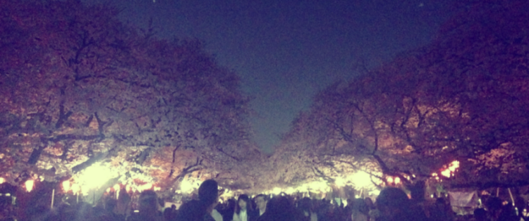ぼんぼりの灯りが白っぽい花びらを透かして、辺りをピンクに染めていました
